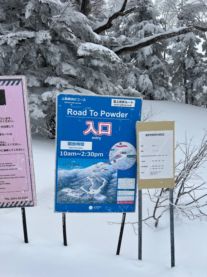 Road To Powder!第三クワッドリフト降りて少し右に行くと、この看板がありました!歩いた先は人もいなくて楽しかったです!スノーボードはワンフットでいけます!若干下に落とされそうですが、、!