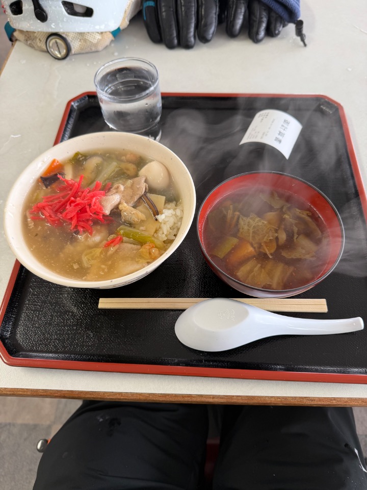 中華丼とミニきのこ汁のセット、体が温まりました。膝までのパウダーもご馳走様でした。