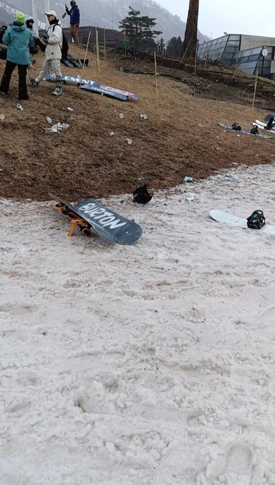 手前にはソールを下にして板が埋もれています